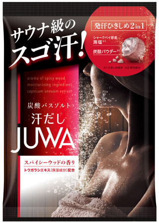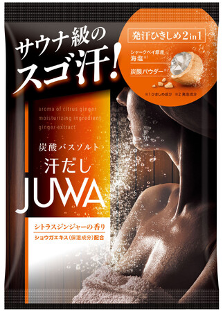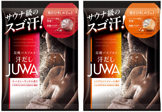 『汗だしJUWA』は、バスソルトでありながら発泡する様子も楽しめる新感覚バスソルトです。世界遺産オーストラリア シャークベイ原産の海塩*1をじゅわっと弾ける炭酸パウダー*2でコーティングし、その炭酸パウダーが発泡したあと、内側の海塩が溶けだす2段階処方となっており、サウナのようにじゅわっと汗だし、気分がスッキリととのいます。さらに、スパイシーウッドの香りにはトウガラシエキス*3、シトラスジンジャーの香りにはショウガエキス*3を配合しています。*1:ひきしめ成分 *2:発泡成分 *3:保湿成分