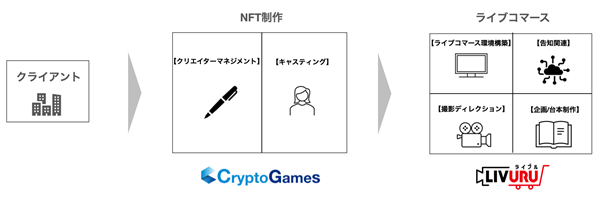 ブロックチェーンゲーム、NFTサービスの開発を行う、CryptoGames株式会社(東京都渋谷区、代表取締役:小澤 孝太)は、戦略型ライブコマースの「LIVURU(ライブル)」(https://livuru.jp/)を提供する、株式会社テイラーアップ(所在地:東京都渋谷区、代表取締役社長:松村 夏海)と業務提携を開始いたしました。ライブコマースのトップランナーであるLIVURU(ライブル)との提携により、NFT制作の背景をデジタル上で伝えることを可能にし、NFTの差別化を実現するだけでなく、WEB3領域におけるコマースを実現し、NFTやライブコマースへの参入障壁を下げ、マスアダプションを加速させてまいります。