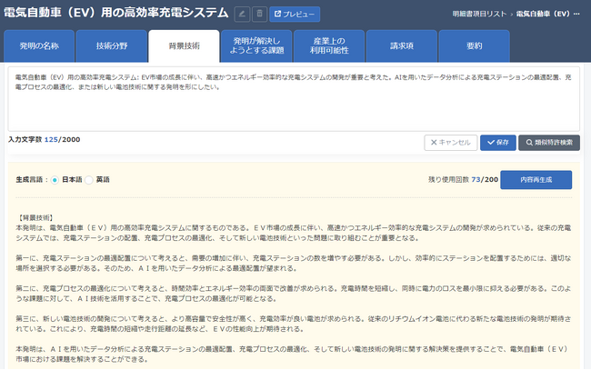 導入効果:企業が新しいアイデアや技術を開発した際、特許文案生成AIを利用することで、そのアイデアを効率的かつ正確に特許文案に変換することが可能になります。このプロセスにより、企業は迅速に特許を申請し、イノベーションを保護することができます。