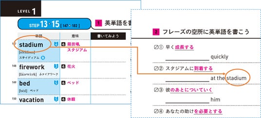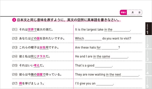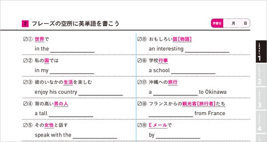 短いフレーズや日本語の空所に書き込みながら、記憶を定着させます。