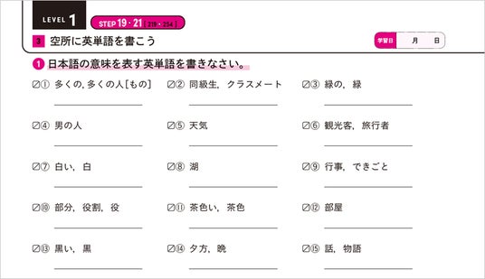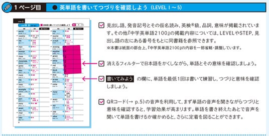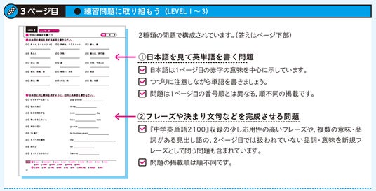 英単語が覚えられずに悩んでいる中学生や、『英単語2100』をお持ちで学習した単語をより確実に定着させたい方にオススメ。『英単語2100』は本書とリンクしているので、合わせて使えば学習効果が高まります。しっかりと自宅で単語学習をしたい方にとって最適の一冊です。