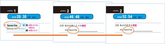 1回の学習単位は、LEVEL 1~3は約40単語で4ページ構成、LEVEL 4~5は約50単語で2ページ構成(それぞれ最終回は3ページ構成)にしています。