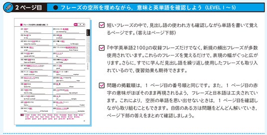 また2~3ページ目には、『英単語2100』の収録フレーズだけでなく、新規の頻出フレーズを多数使用して問題を構成しています。これらのフレーズを覚えるだけで、表現の幅がぐっと広がります。