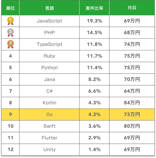 Go言語の案件は市場全体の4.3%を占めており、案件数ランキングでは9位に位置しています。この数字は、Goがメインストリームのプログラミング言語として一定の市場シェアを確立していることを示していますが、Java、Python、JavaScriptなどの主要言語と比較するとまだ成長の余地があります。しかし、クラウドネイティブ開発やマイクロサービスアーキテクチャの普及に伴い、その需要は着実に増加傾向にあります。専門性を持ったGo開発者は市場で重宝される存在であり、その希少性から競争力のある報酬を期待できる状況にあります。