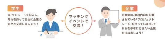 学生の自己PR及び受入企業の業務内容等の案内の場として交流会を実施。交流会後に学生と企業、双方の希望をヒアリングしマッチングを行います。