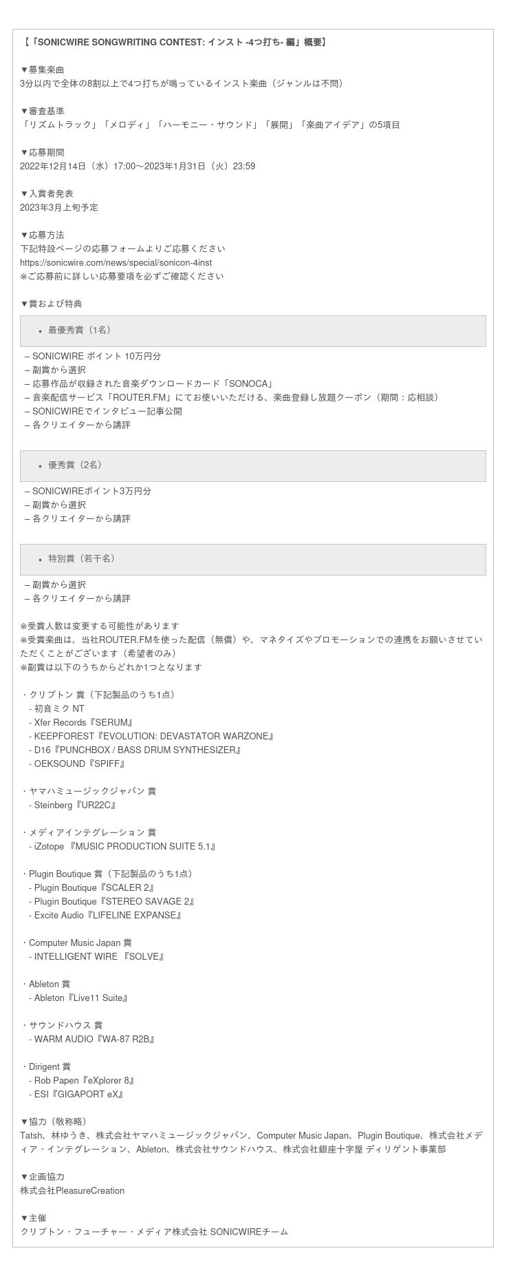 クリプトン・フューチャー・メディア株式会社(本社:北海道札幌市、代表取締役:伊藤博之、以下クリプトン)は、次世代の音楽クリエイターの発掘と創作支援を念頭に、DTM楽曲コンテスト「SONICWIRE SONGWRITING CONTEST: インスト -4つ打ち- 編」を開催いたします。今回は2022年12月14日(水)17:00~2023年1月31日(火)23:59まで、3分以内の「4つ打ちのインスト楽曲」を募集。最優秀賞以外にも優秀賞や特別賞をご用意しておりますので、この機会にふるってご応募ください。