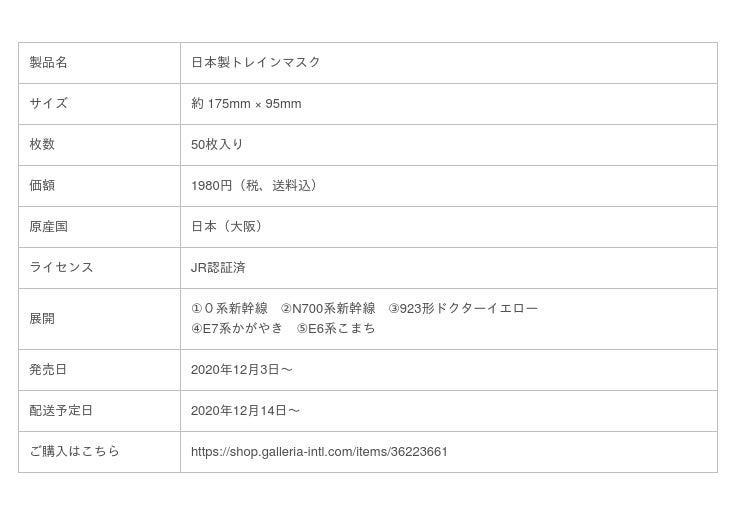 生活雑貨関連用品の企画・開発・販売を行う株式会社ギャレリアインターナショナル(東京本社:東京都渋谷区、代表取締役:阪崎 英一郎、以下 ギャレリア)は、JR承認済の電車を連結ができる「トレインマスク」0系新幹線、N700系新幹線、923形ドクターイエロー、E7系かがやき、E6系こまちを12月3日より販売いたします。