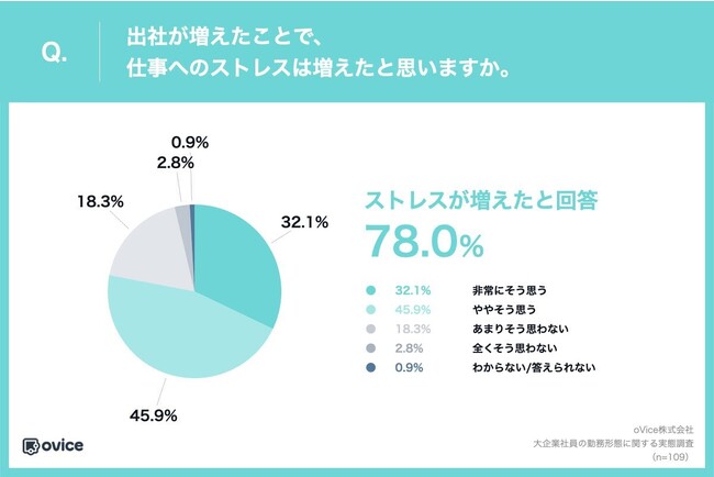 出社に意義を感じている人が約8割いる一方で、「出社が増えたことで、仕事へのストレスは増えたと思いますか。」(n=109)という質問に対し、78.0%(「非常にそう思う」が32.1%、「ややそう思う」が45.9%)が仕事に関するストレスが増加していると回答しました。