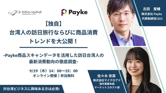 株式会社マイクロアド(本社:東京都渋谷区、代表取締役社長:渡辺健太郎、以下 マイクロアド)は、株式会社Paykeとともに、消費財メーカーを中心とする企業の台湾人向けインバウンドマーケティング担当者に対し、オンラインセミナーを開催いたします。