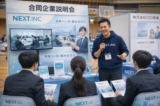 従来の合同企業説明会との違い、 全参加学生が全参加企業と接点を持てるプログラム設計にしています。全企業が全学生に対し、プレゼン方式で順番に会社説明、ローテーション形式の座談会も実施し、全学生に企業ごとの個別アプローチも可能な設計にすることで、近年の売り手市場が進む採用現場の中でも、学生と確実に接点を持てる機会を創出。 また、参加する人事担当は全員ブローウィンズパーカーを着用。会社ごとの雰囲気の差をならすことで、企業名や担当者の印象に左右されず、学生が“企業の本質”をフラットに見てもらえる環境を実現します。
