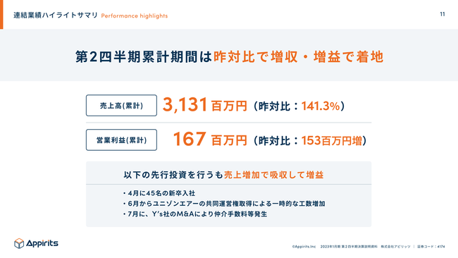 2023年1月期 第2四半期 業績ハイライト(決算説明資料一部抜粋)