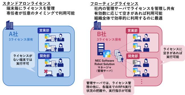 従来のスタンドアロンライセンスは、RPAを実行する端末毎にライセンスが必要です。また、従来でもフローティングと呼ばれるライセンスは、実行端末数ではなく同時実行数に紐づいて利用できますが、管理サーバの構築が必要で、実行状況の把握や管理ができ全社的なライセンス共有に向くという反面、利用には少しハードルがありました。従来のライセンスに加えて今回新たに提供する組織内共用ライセンスは、従来のフローティングライセンスよりも手軽にライセンス共有が可能なため、同じフロア内や同じグループ内などで手軽にRPAの利用者を増やしたい場合に最適です。