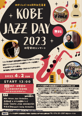 毎年4月30日は「国際ジャズ・デー」ですが、今年、神戸では1923年4月、神戸でプロバンドによるジャズが初めて演奏されてから、100周年を迎えます。これを記念して様々な企画を実施。「神戸ジャズの日」のイベントとして毎年4月に開催している「KOBE JAZZ DAY」を2023年4月2日(日)、神戸・旧居留地の屋外空間にて開催します。豪華プロミュージシャンや元気あふれる学生バンドらによるスペシャルなコンサートです。ぜひ足をお運びください。