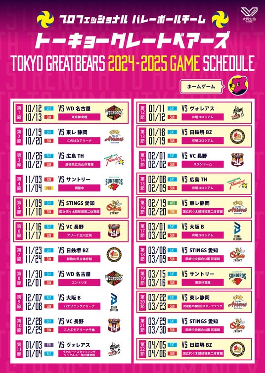 このたび、2024-2025 大同生命 SV.LEAGUE MENのゲームスケジュールが決まりましたので、お知らせいたします。
