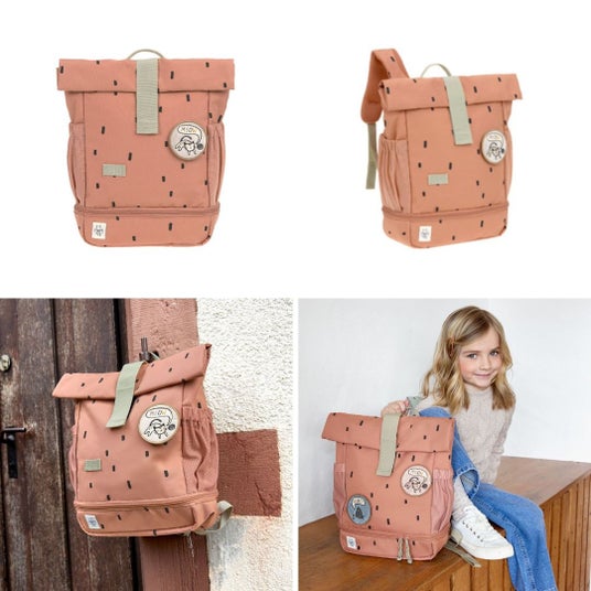 ミニロールトップバックパックは3歳以上のお子様に適した9L容量のバックパックで、遠足やアウトドア、幼稚園・保育園への通学バッグにおすすめです。ロールトップデザインにより、容量を9Lから11Lに拡張可能で、収納量を調整することができます。リュック背面のファスナーは、メイン収納スペースへのショートカットになっており、荷物が多くなった際に取り出しやすくなっています。