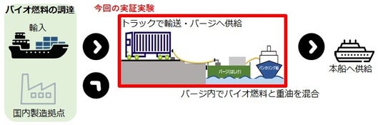 本実証実験では、川崎港のカーボンニュートラル化を目指す川崎市と、船舶燃料の脱炭素化に取り組むNX商事株式会社及び兼松ペトロ株式会社が協力して、川崎市内の港湾施設に設置した船舶への燃料供給用ステーションバージ(台船)に、国内や海外から調達したバイオ燃料(FAMEを予定)を供給。バージ内で重油と混合し、混合した燃料(B24)をバンカリング船を介して本船に供給します。