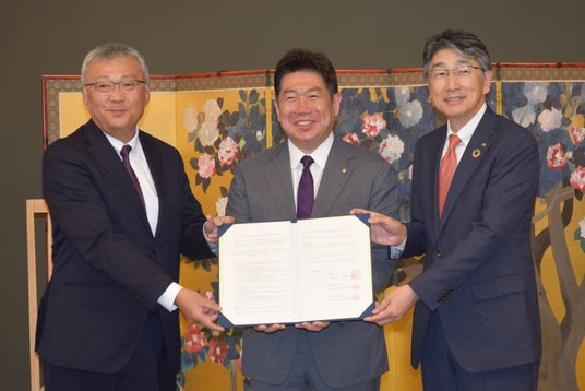 【左:西山社長 中:福田市長 右:青木社長】