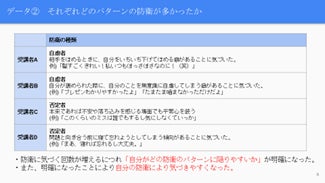 - 防衛の種類分け(テキスト70ページ参照)をし、それぞれどの種類の防衛が多かったか分析