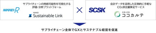日経リサーチが展開するサステナブル経営評価プラットフォーム「日経サステナブルリンク」と、SCSKが提供するCO2排出量自動算定ソリューション「CO×COカルテ(ココカルテ)」をサービス提携し、両サービスのデータに基づいたサプライチェーンの可視化と改善活動を統合的にサポートします。