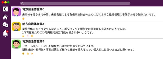 - - 教室レイアウト、トイレ改修、ICT環境、バリアフリーなど、日々の悩みをそのまま投稿。コミュニティ内では、他の自治体の担当者から事例紹介やコメントが寄せられ、実務に活かせるヒントが得られます。