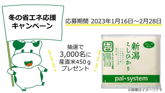 キャンペーンは、パルシステムの利用者家庭に2月末までの省エネによる電力使用量削減を呼びかけます。前年同月もしくは前月に比べ電力消費量を1khw以上削減すれば達成となり、利用者はHPのフォームから参加することができます。キャンペーンに参加された方から抽選で3,000名に産直米450gをプレゼントします。