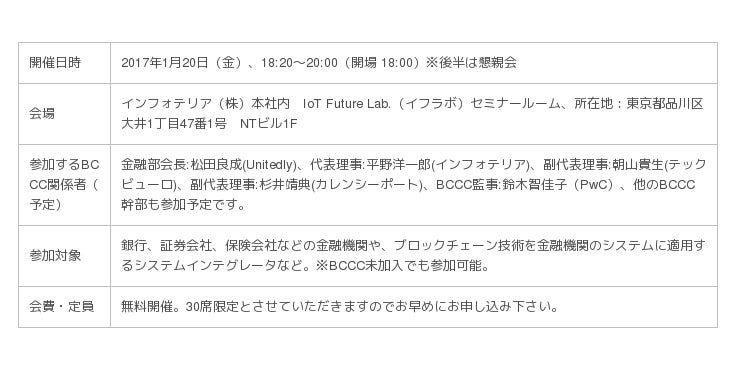 一般社団法人ブロックチェーン推進協会(代表理事:平野洋一郎、インフォテリア(株) 代表取締役社長、以下 BCCC)は、加盟が加速する金融機関への普及・啓発を強化する施策として、2017年2月に「金融部会」を新設することを決定していますが、当部会の新設に際し2017年1月20日に参加を希望する金融業界関係者向けの説明会を開催します。なお、この説明会には会員以外の企業・団体も参加可能となりますので、ご関心がありましたらお気軽にご参加ください。報道機関の皆さまにも公開致します。参加方法は以下要領にてお願い致します。(事前申し込みのない方は参加できませんのでご注意願います。)
