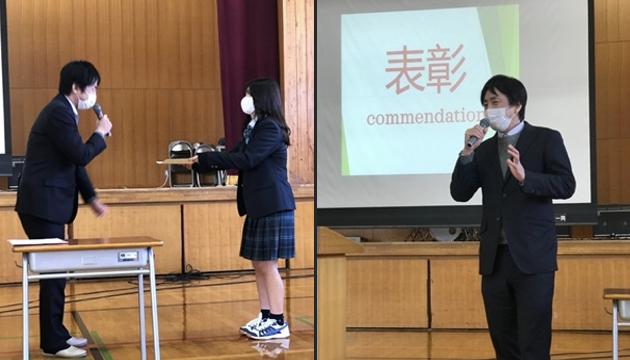 終業式の日に弊社代表山口によるレシピー杯特製の表彰状の進呈も行って頂き、学校側としても英語学習への良い動機付けを提供できるイベントになりました。