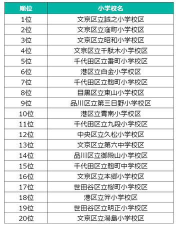 高い進学率を誇る文京区にある名門公立小学校、通称「3S1K」と言われる4校が上位を占める結果となりました。5位以降も人気の高い名門公立小学校がランクインしています。また、国立・私立中学校への進学率1位であることからか、上位20位のうち文京区が7学区ランクインする結果となりました。