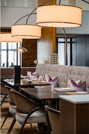 26階の「ザ・スコア・ダイニング」は、音楽を共有するために必要な “楽譜” になぞらえた4つのレストランが競演するエリア。多くの賞に輝くスターシェフたちによる、独創的な美食の数々を楽しめるデスティネーション・レストランです。ギリシャ語で“リズム”を意味するカフェ&バー「リュトモス」は、スコア・ダイニングの世界へお客さまをいざなうエントランスです。続くイタリアングリル「メロディア」は、音楽を構成する要素のひとつであるメロディをイメージ。「リュトモス」の空間とデザインをゆるやかに引き継ぎ、「メロディア」の空中に浮かぶ照明が音符を思わせます。東京のパノラマが広がる圧巻の眺望が堪能できる「チャイナシャドー」は、オーセンティックなチャイニーズをベースに新たな食材やエッセンスを掛け合わせた中国料理の数々を提供します。そしてアトリウムの中央、「リュトモス」と「メロディア」の間には、鉄板焼「風音」。ストリングスホテル東京インターコンチネンタルが奏でる「ザ・スコア・ダイニング」は品川上空で味わえる唯一無二の美食の競演です。