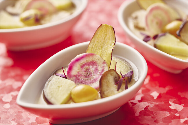干し椎茸の上質な出汁とトリュフが香るイタリアン茶碗蒸しに仕上げました。ビタミンCが豊富な銀杏やサツマイモチップ、キャンディービーツを添えて。