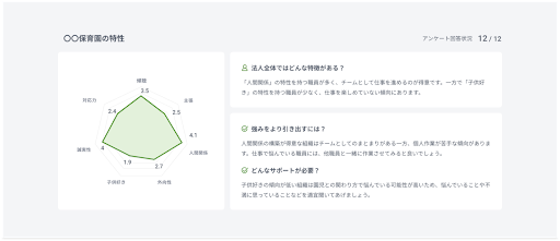 法人全体・施設ごと・職員ごとに、特性がわかります。それぞれどんな強みがあり、その強みを発揮してもらうためには何が必要かが把握できるので、人材配置やマネジメントに役立てることができます。