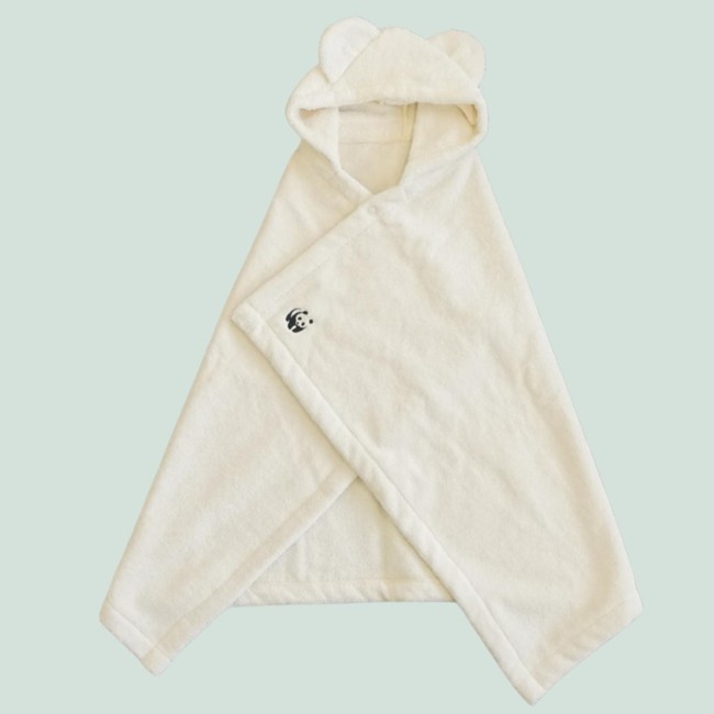 本商品は、ボタンを留めると耳付きのかわいいフード付きポンチョとして、外すとバスタオルとして、沐浴やプールなど幅広いシーンで使っていただけるデザインです。カラーはナチュラルな生成りで、ワンポイントのパンダロゴ刺しゅう入りです。厳格な認定基準をクリアして認められたGOTS認証オーガニックコットン100%使用、有害薬剤不使用、無染色・無漂白・無蛍光のため、肌がデリケートな赤ちゃんにも安心してご使用いただけます。