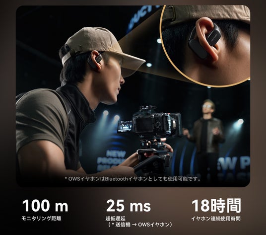 2.4 GHz周波数ホッピング技術による安定リンクで、送信機→受信機→OWSイヤホン(※)まで約20ms以下の遅延を実現。ケーブルなしで動きながらのリアルタイム音声チェックが可能となります。
