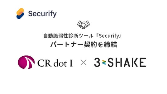 株式会社スリーシェイク(本社:東京都新宿区、代表取締役社長:吉田 拓真、以下スリーシェイク)は、株式会社CRドットアイ(本社:東京都台東区、代表取締役:小林 啓志、以下CRドットアイ)と、手軽に社内でセキュリティ診断を実施できる自動脆弱性診断ツール「Securify(セキュリファイ)」において、パートナー契約を締結したことをお知らせします。