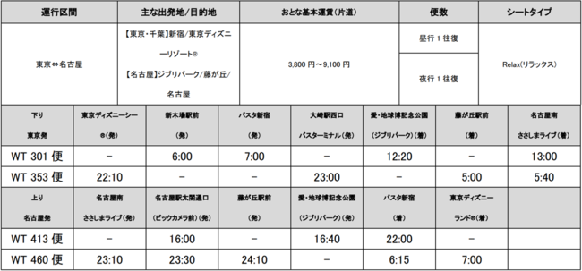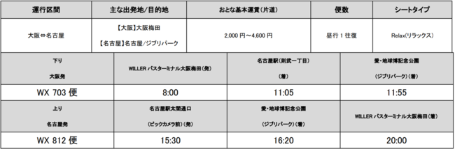 ・料金:「東京~名古屋線」片道2,500円、「大阪~名古屋線」片道1,500円