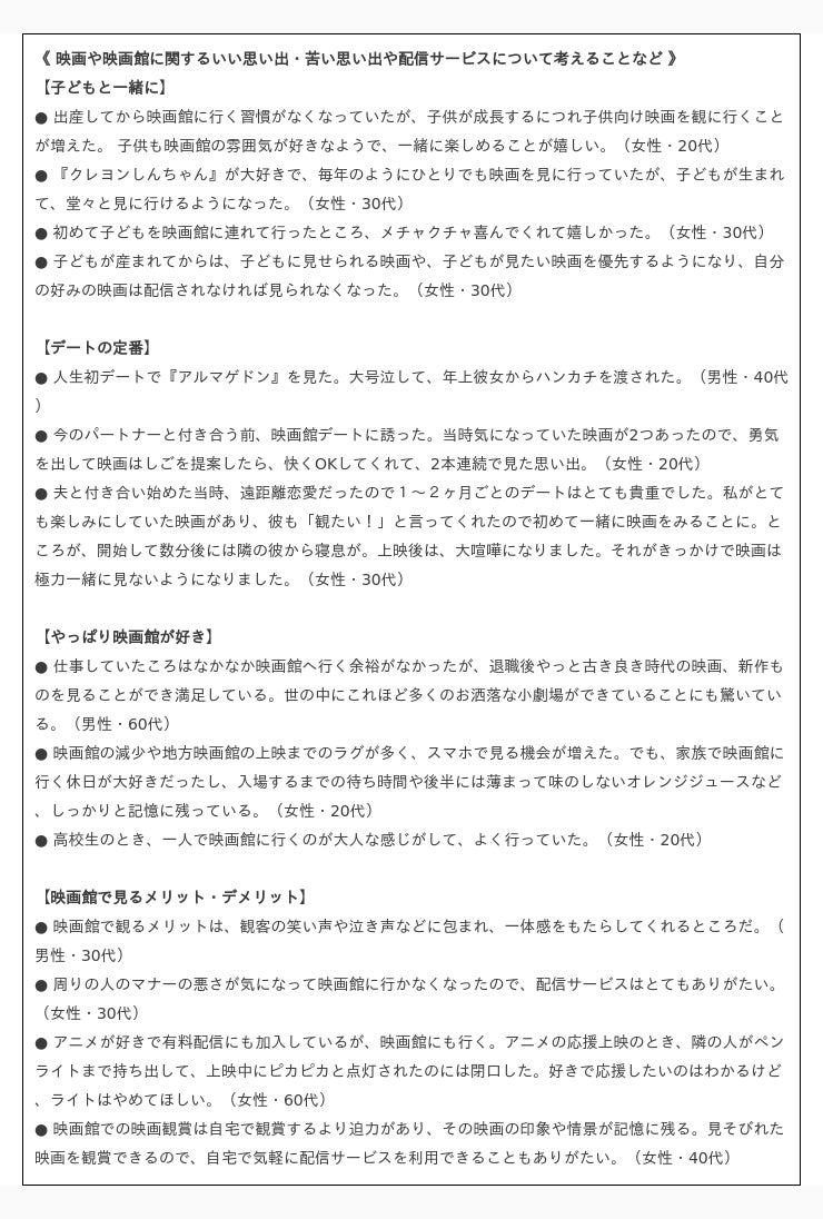 映画や映画館に関する思い出、動画配信サービスについて感じること、考えることなどを自由回答で聞きました。映画を見るとき、映画館で見たいか、自宅で見たいかを聞いたとき(図表5)、年代別にそこまで大きな差がありませんでした。寄せられた回答を見ると、「絶対に映画館で見たい」「絶対に自宅で見たい」と意見がきれいに分かれるのではなく、全年代を通じて、「映画館には映画館の良さがある」「配信は映画館にはない便利さがある」とさまざまな映画の楽しみ方を肯定的に捉えている人が多いようでした。