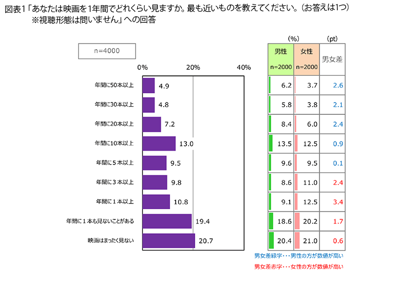 まず、視聴形態を問わず、映画を年間でどのくらい見るかを聞いたところ(図表1)、「映画はまったく見ない」と回答した人が20.7%で、「年間に1本も見ないことがある」人が19.4%いました。