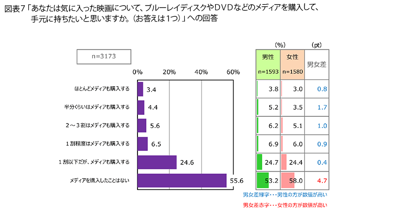 「あなたは気に入った映画について、ブルーレイディスクやDVDなどのメディアを購入して、手元に持ちたいと思いますか」と質問したところ(図表7)、「メディアを購入したことはない」という人が55.6%で、過半数という結果でした。