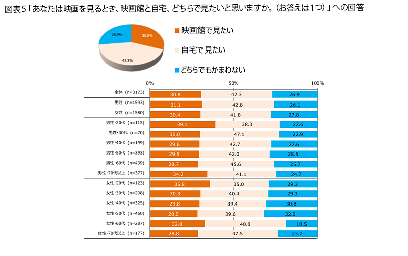 また、映画を見ることがある人を対象に、映画を見るとき、映画館と自宅のどちらで見たいかを聞くと(図表5)、最も割合が高いのは「自宅で見たい」の42.3%です。「映画館で見たい」は30.8%、「どちらでもかまわない」は26.9%でした。