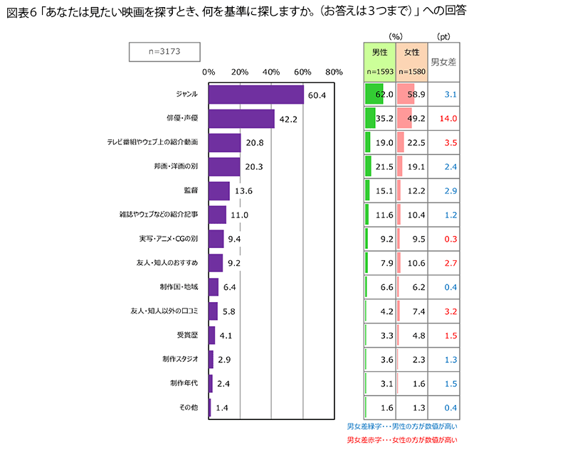 映画を見る人を対象に、見たい映画を探すとき、何を基準に探すかを聞くと(図表6)、最も割合が高かったのが「ジャンル」(60.4%)でした。
