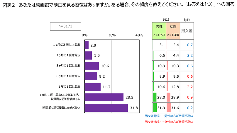 次に、映画館に行く頻度を聞くと(図表2)、「映画館に行く習慣はまったくない」という人が31.8%でした。また、「1年に1回も見ないことがあるが、映画館に行く習慣はある」という人は28.5%でした。2つの項目を合計すると、60%を超えます。