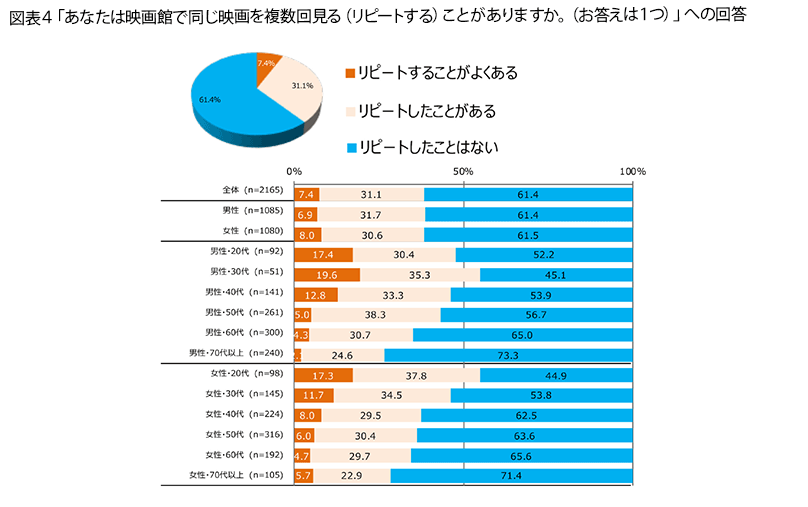 続いて、映画館に行く習慣がある人を対象に、映画館で同じ映画を複数回見る(リピートする)ことがあるかを聞くと(図表4)、「リピートしたことはない」人が61.4%と最も高い割合でしたが、「リピートしたことがある」が31.1%、「リピートすることがよくある」が7.4%でした。