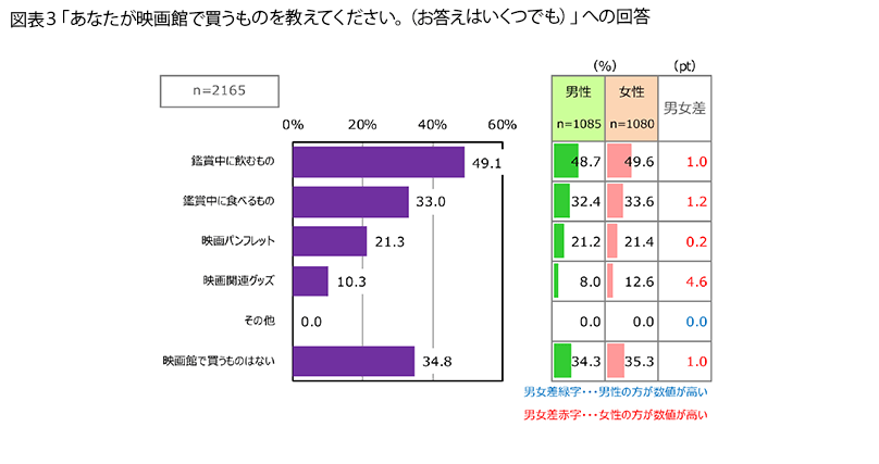 また、「映画パンフレット」は21.3%、「映画関連グッズ」は10.3%の人が買うようです。一方で、「映画館で買うものはない」という人は34.8%いました。