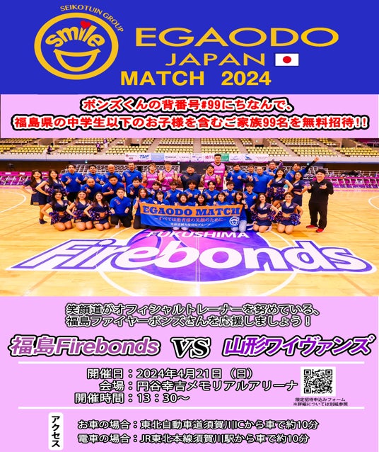 この度、株式会社爽健グローバル (本社:東京都新宿区、代表取締役:福田秀人、以下爽健グローバル)が運営する「笑顔道鍼灸接骨院グループ」は、オフィシャルトレーナー契約をさせていただいているプロバスケットボールチーム「福島ファイヤーボンズ」の試合におきまして、「EGAODO MATCH 2024」を開催させていただきます。