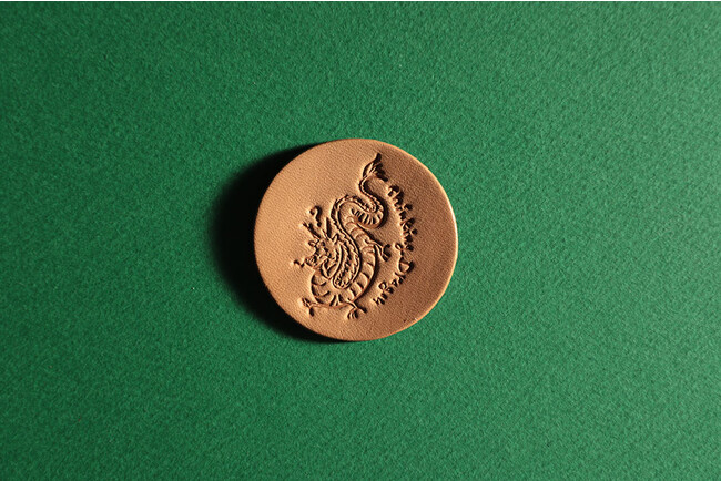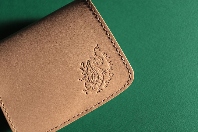 革の色を選んでオリジナルカラーの革小物が作れるサービス「カラーオーダー」。革の色はもちろん、ロゴを自分好みに変更することもできます。2024年は辰年ということで「考える辰」のロゴが仲間入り!
