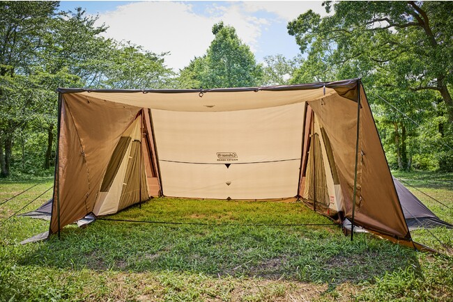 2本のポールで立ち上げるシンプル構造のシェルターです。付属のフロントウォールやサポートポール、別売りのキャノピーポールによってシーンや人数に合わせ、変化自在に張り方をアレンジすることができるため、状況に合わせた最適なスタイルを楽しむことができます。マスターシリーズの特徴であるフルスカートを採用しており、日本の4季に対応するための機能として寒い風から守ってくれるため快適にキャンプを楽しめます。また、別売りの専用インナーテントで2ルームテントに変化、2つ使用することで2ベッドルームにもなりグループキャンプに最適です。