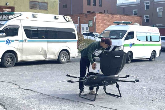 離陸前、物流ドローンに血液製剤の入った専用箱を取り付ける様子(ウランバートル市 国立輸血センター)