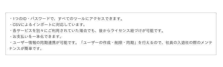 すべてのツールに1つのID・パスワードからアクセスできるため、管理も簡単。さらに、“機能連携”によりツール間をシームレスに繋ぐことで相乗効果をもたらし、大幅な業務効率アップを実現します。