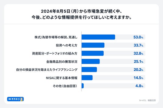 調査対象者の中から資産運用をしていると回答した方へ「市場急変が続く中、今後、どのような情報提供を行ってほしいと考えますか。」と質問したところ、株式/為替市場等の解説、見通し53.0%、投資への考え方33.7%、資産配分・ポートフォリオの組み方32.8%の順に多い結果となりました。専門家の知見をもとに、株式/為替市場、そして投資を改めて理解し、自分に合った資産運用を確立していきたい方が多いことが伺えます。