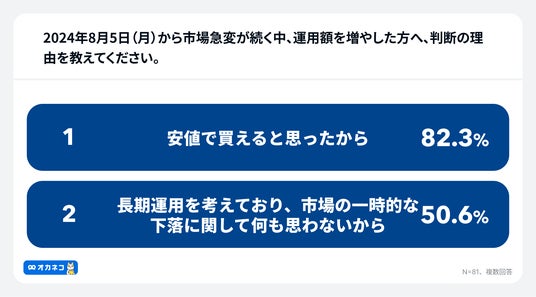 次いで、調査対象者の中で資産運用をしており、2024年8月5日(月)から市場急変が続く中、運用額を増やした方へ判断の理由を質問したところ、安値で買えると思ったから82.3%、長期運用を考えており、市場の一時的な下落に関して何も思わないから50.6%の順に続きました。長期的な資産運用を見据え、市場の下落時も強気な姿勢を保っている方も一定いらっしゃることがわかります。